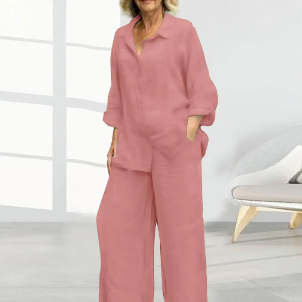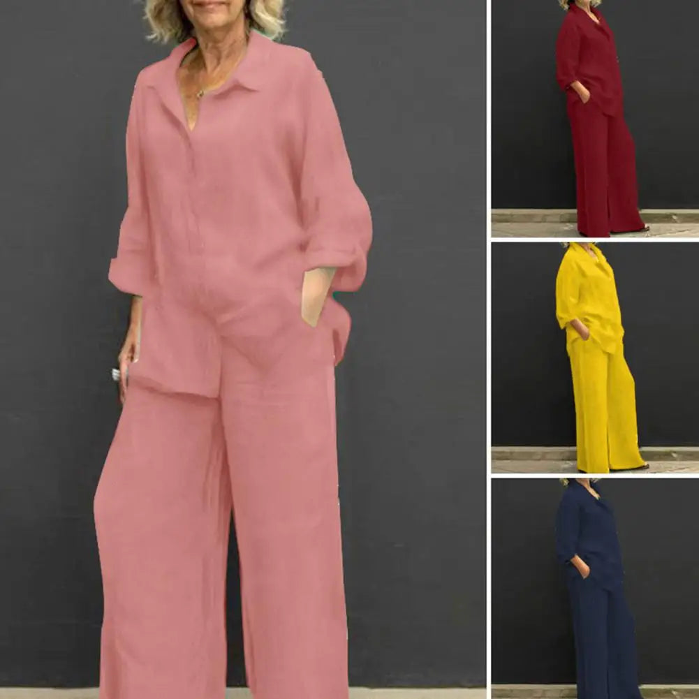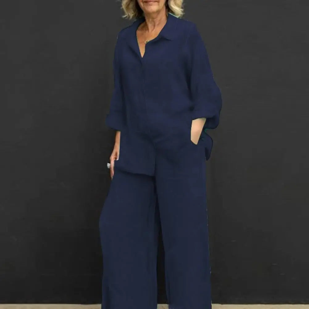 Linen Suit Set with Long Sleeve Shirt Wide Leg Trousers