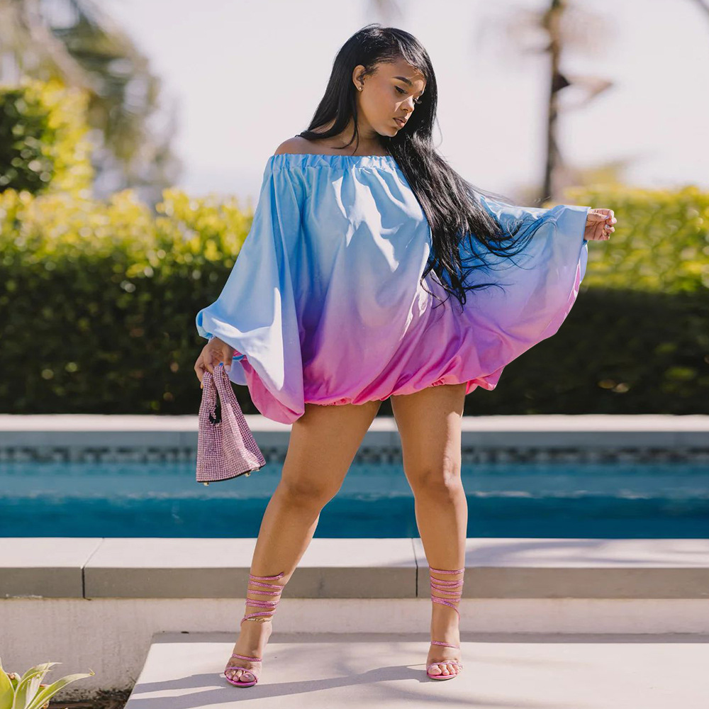 Off Shoulder Slash Neck Lantern Long Sleeve Printed Dress