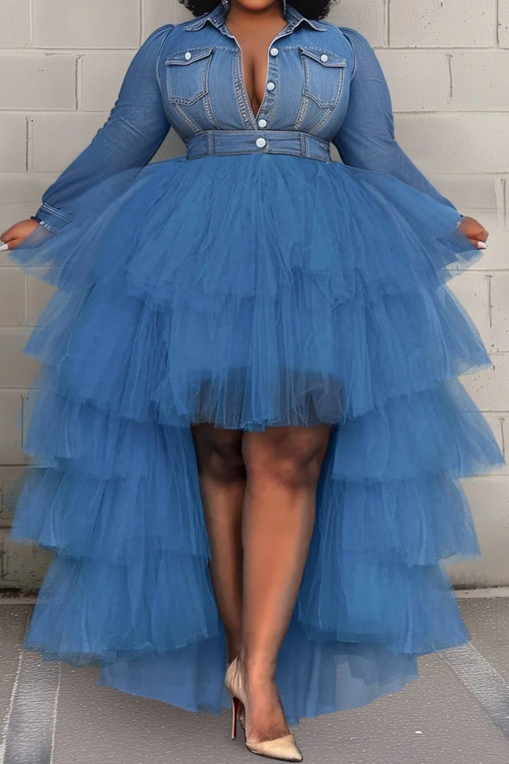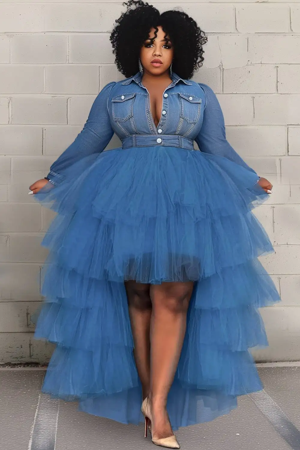 Plus Size Daily Blue Tiered Tencel Denim Two Piece Skirt Sets