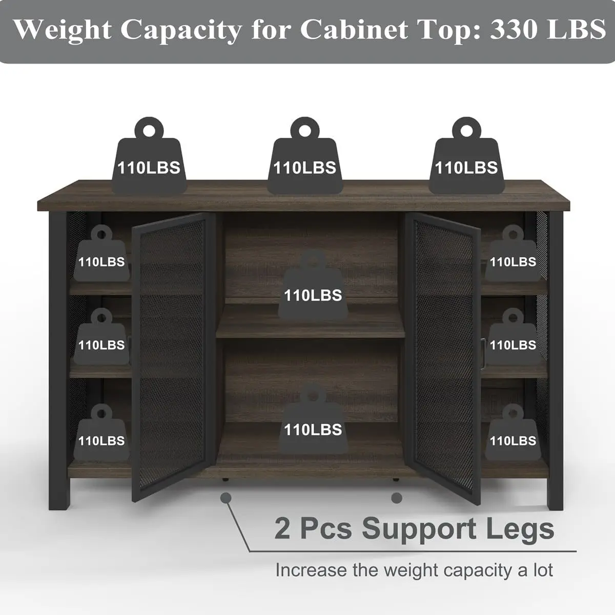 [100% NOT WOBBLE & High Weight Capacity]: Thanks to its high-grade materials and well-structured design, this wine rack cabinet stands strong and stable. The addition of two support legs under the bottom shelf significantly enhances its weight capacity and stability. The tabletop can easily hold up to 330 lbs, while each shelf has a weight capacity of 110 lbs.