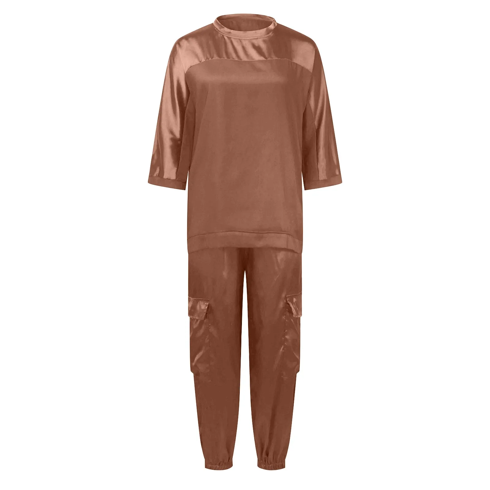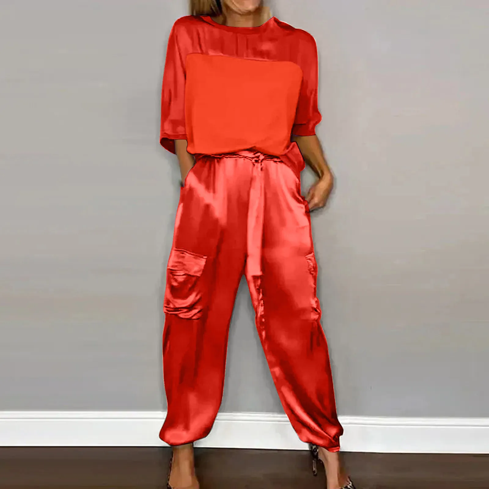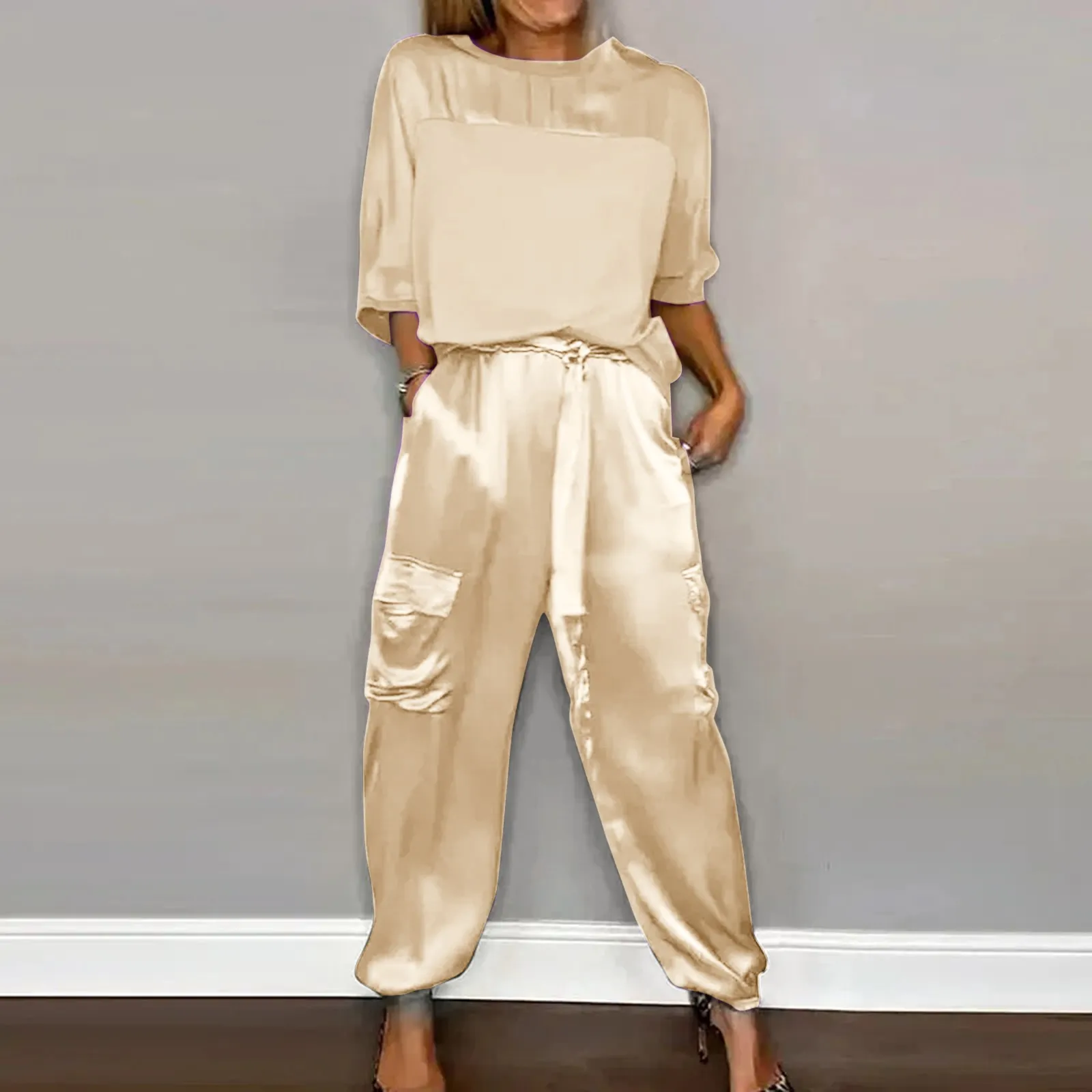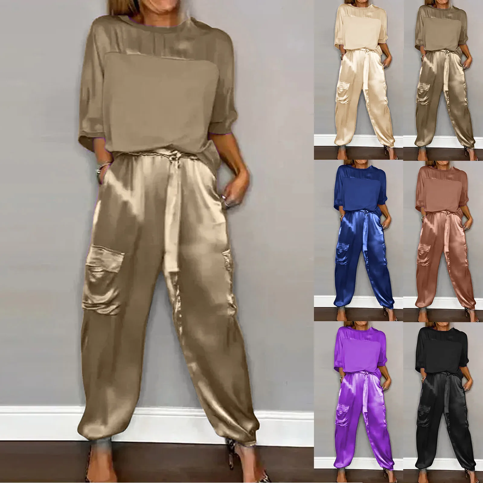 Women's Smooth Satin Short-sleeved Top and Pants Two-piece Set
